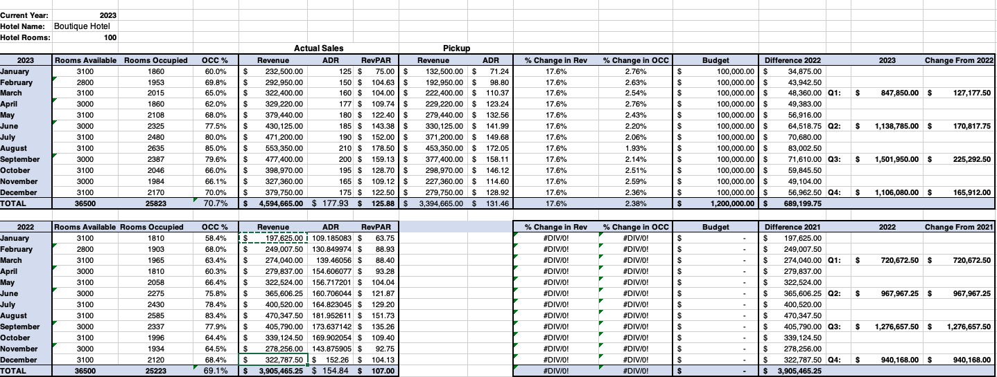 - Summary Sheet: Monthly rooms, revenue, ADR, RevPAR by month for current and previous years