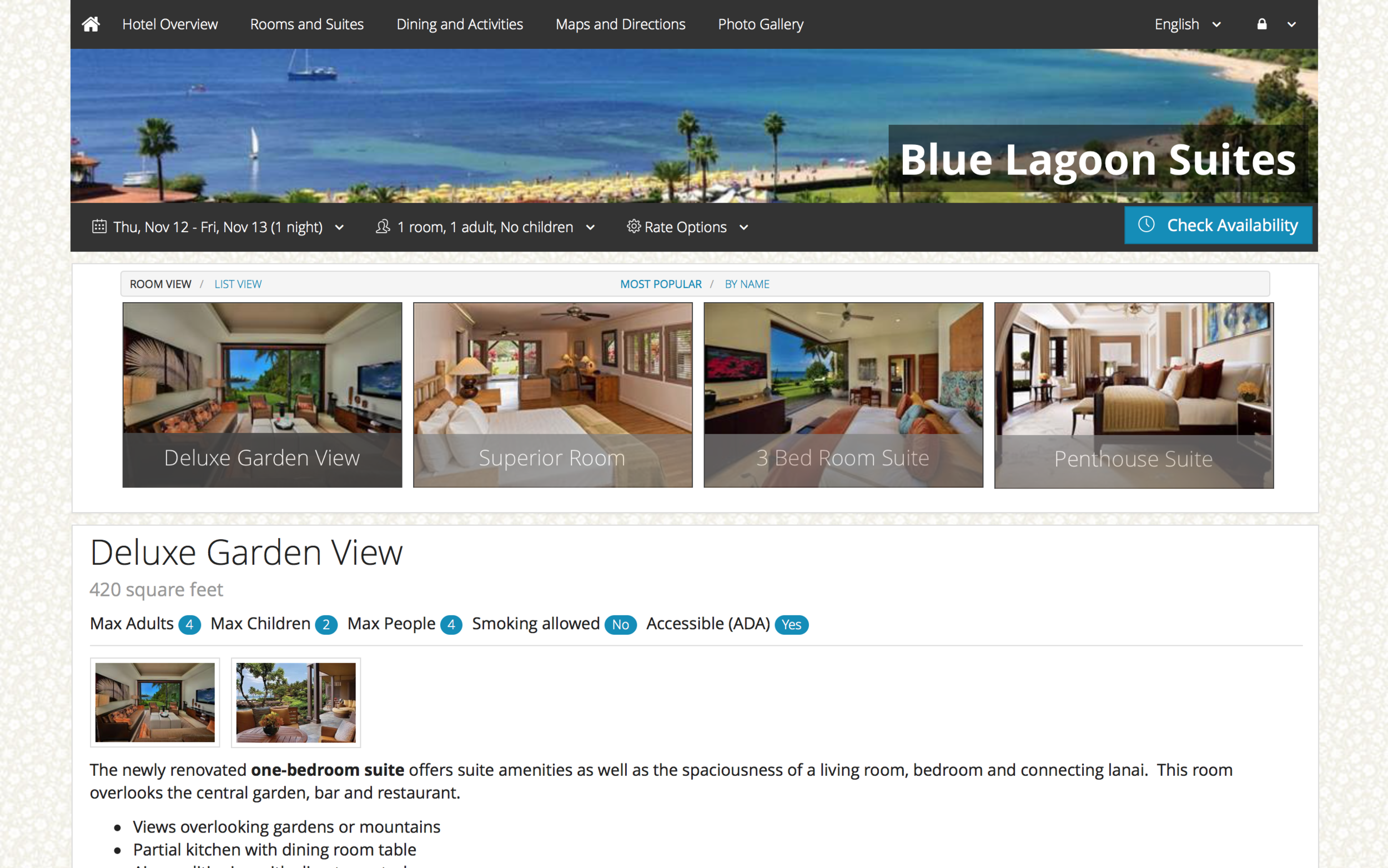 The interface can be customized through some programming, but the default is rather gorgeous. It scales well in a browser window on a desktop, but is fully mobile ready for iPhones or iPads. The default design is one of the better designs I have seen for a hotel, and certainly one of the best basic designs without having to spend extra money for extra features.