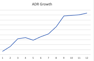 With the charts above, Year 1 is the year prior to the SKKY Hotel working with Four Sides Hospitality Consulting. Year 11 and 12 are the pandemic years, which caused the revenues to crash, but the ADR continued to grow.